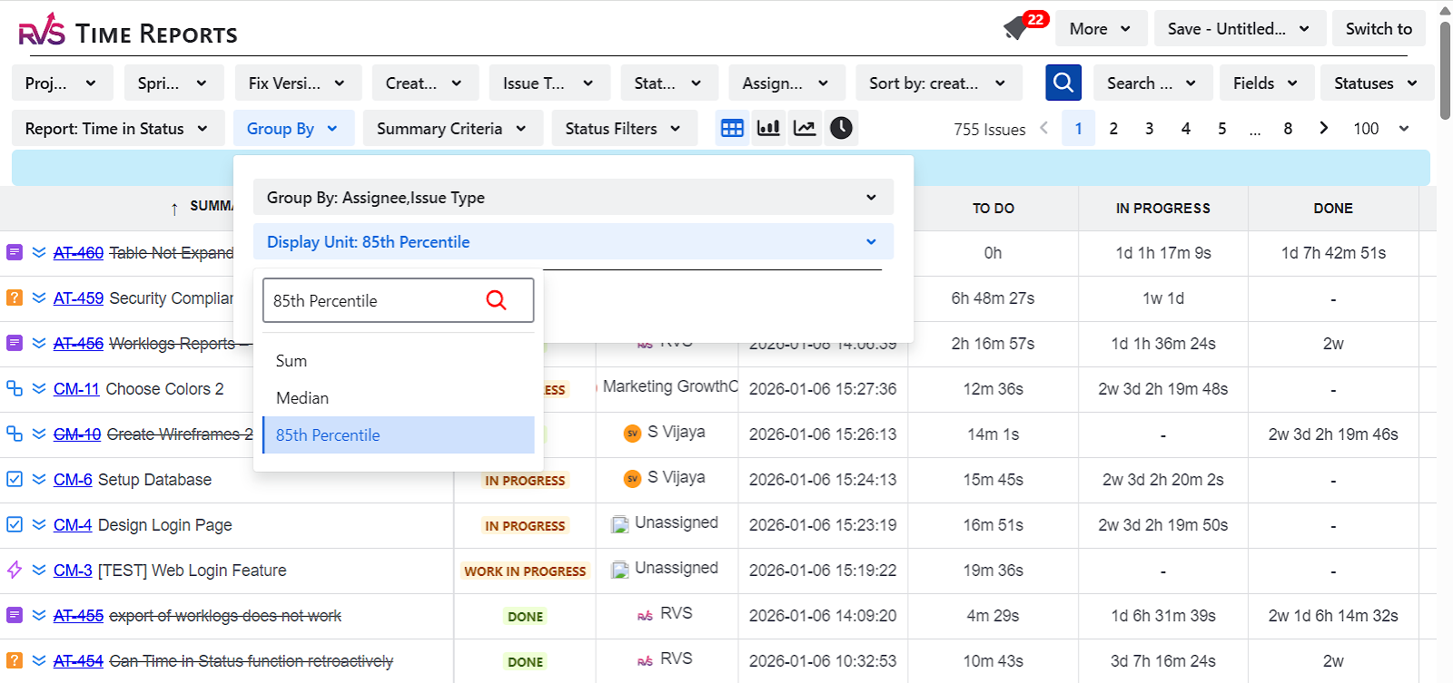 RVS Time in Status Report offers a variety of key metrics, enabling teams to track and visualize project data with precision.