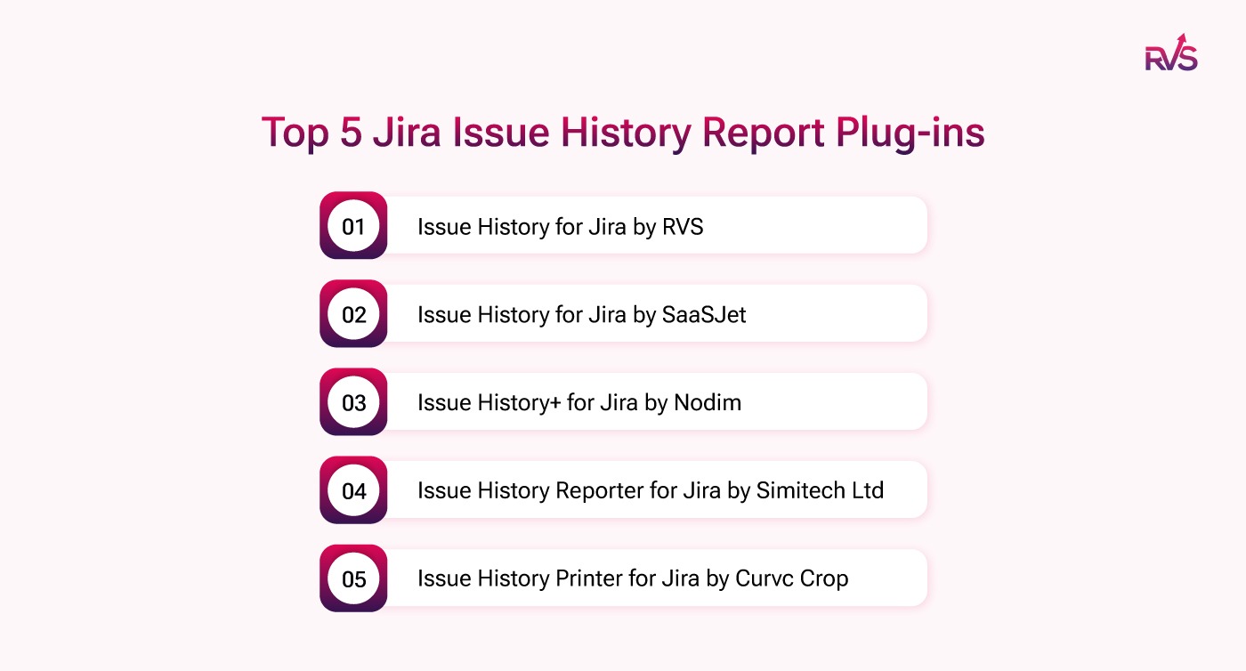 This blog covers the Top 5 Jira Issue History Report Plugins for 2026, focusing on plugins like RVS, which offers customizable, consolidated reports for better workflow tracking. It highlights how these plugins help teams identify bottlenecks, optimize processes, and improve efficiency, with RVS emerging as the best choice for its powerful features and user-friendly design.