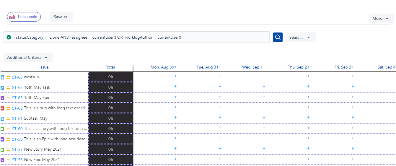 View and enter time spent on all issues across multiple days from a single place. The Timesheet feature helps you track time more efficiently, ensuring accurate reporting and better management of resources.