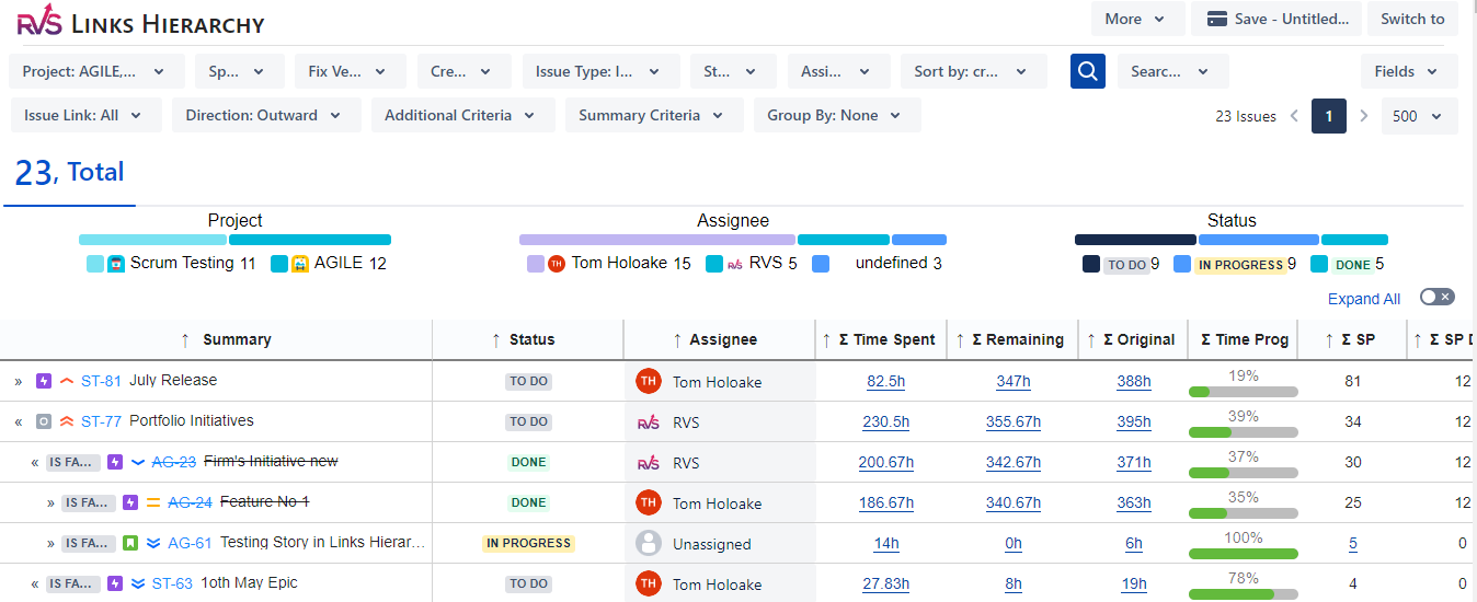 To move beyond the limitations of Jira’s native features, using an advanced solution like RVS Agile Tools can give you an aggregate view of your project’s tasks, epics, and initiatives. It provides a multi-level hierarchy with automatic roll-ups, giving you real-time insights into time spent, estimated time, and task completion percentages.
